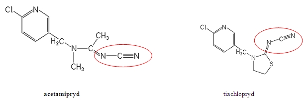 Różnice w budowie chemicznej związków z obu wyżej wymienionych grup wpływają na ich podatność na rozkład w glebie oraz metabolizm w organizmie owada. Substancje cyjanoamidowe nie nadają się na przykład do stosowania w zaprawach nasiennych gdyż ulegają szybkiemu rozkładowi. Różnice te znajdują również odzwierciedlenie w przypadku poziomu toksyczności dla pszczół. Acetamipryd, dzięki brakowi grup nitrowych, jest łatwo metabolizowany przez organizm pszczoły, przez co jego toksyczność dla tych owadów jest niska. Właściwość ta jest szczególnie ważna w aktualnie toczącej się dyskusji nad znaczeniem neonikotynoidów w występujących upadkach rodzin pszczelich określanych powszechnie jako masowe zamieranie rodzin pszczelich.
